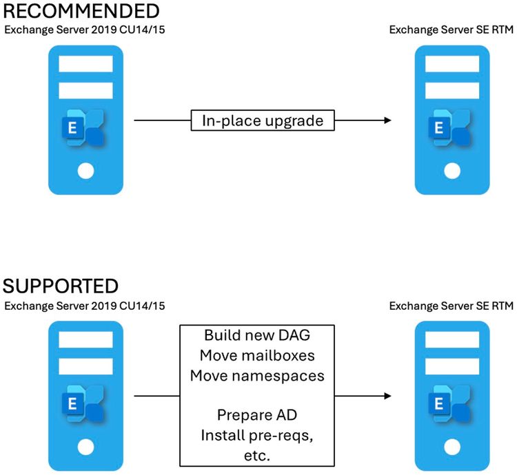 Recomendamos realizar una actualización local a Exchange Server SE RTM cuando esté disponible; sin embargo, también se admiten actualizaciones heredadas de Exchange Server 2019 a Exchange Server SE.