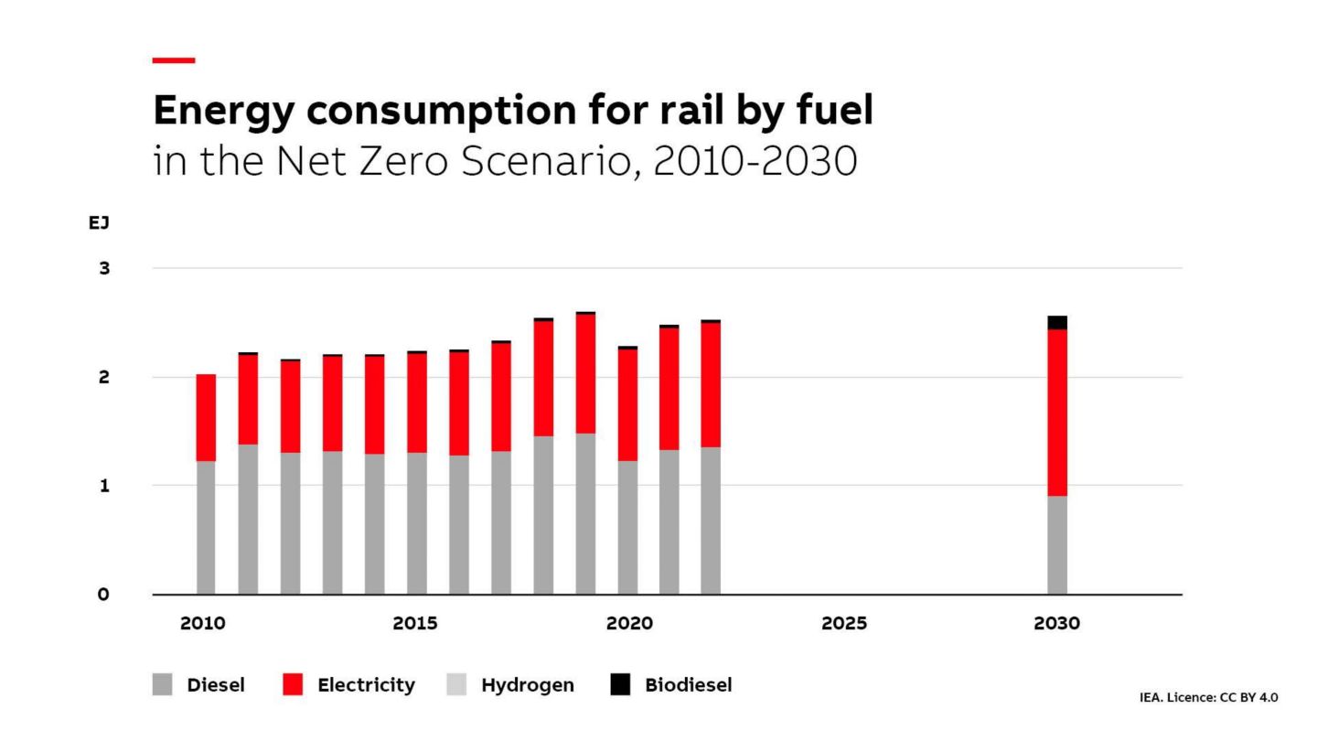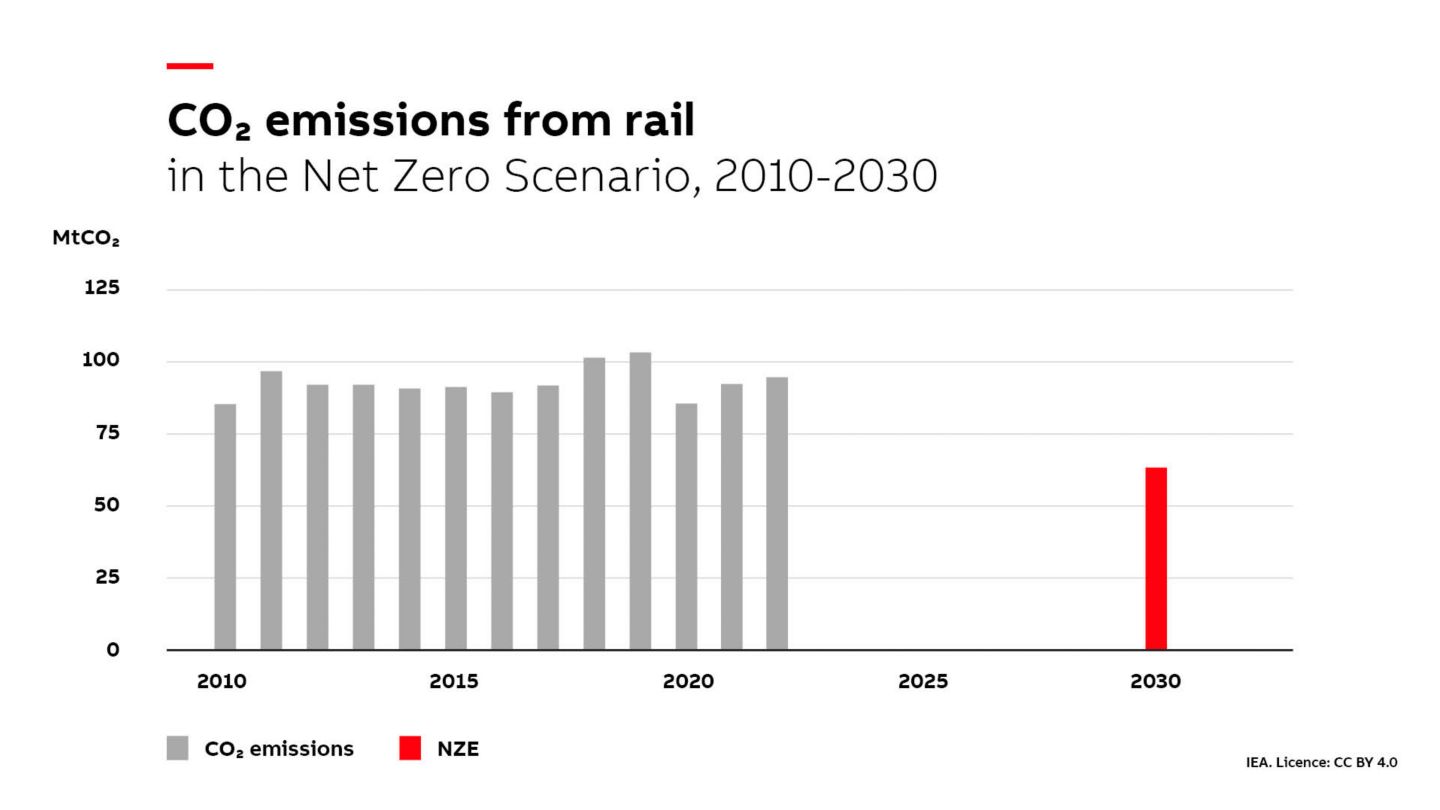 Según la AIE, el ferrocarril transporta alrededor del 7 % del transporte mundial de pasajeros-km y el 6 % de las toneladas-km, pero solo representa alrededor del 1 % de las emisiones del transporte. Esta eficiencia convierte al ferrocarril en un candidato ideal para una mayor electrificación y así maximizar la sostenibilidad. Soluciones como las locomotoras híbridas, los biocombustibles y los trenes propulsados ​​por hidrógeno desempeñan un papel fundamental en la reducción de emisiones en zonas donde la electrificación total no es viable.
