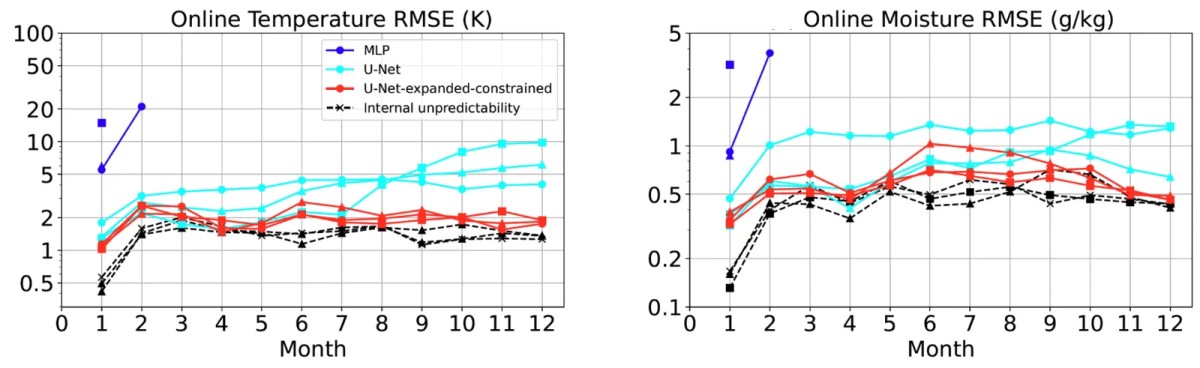 Los científicos de las organizaciones de Investigación y Desarrollo de Tecnología de NVIDIA han logrado un avance importante gracias a estas nuevas API. En nuestro último artículo , publicado el 10 de julio en la revista Journal of Advances in Modeling Earth Systems (JAMES) , demostramos simulaciones híbridas estables de varios años utilizando una red neuronal U-Net entrenada con el conjunto de datos de ClimSim mediante PhysicsNemo . Esto estableció un nuevo punto de referencia para las habilidades en línea dentro de ClimSim-Online. PhysicsNemo es un marco de aprendizaje profundo de código abierto que permite a los usuarios explorar, desarrollar, validar e implementar métodos de vanguardia para la ciencia y la ingeniería que pueden combinar el conocimiento basado en la física con los datos.